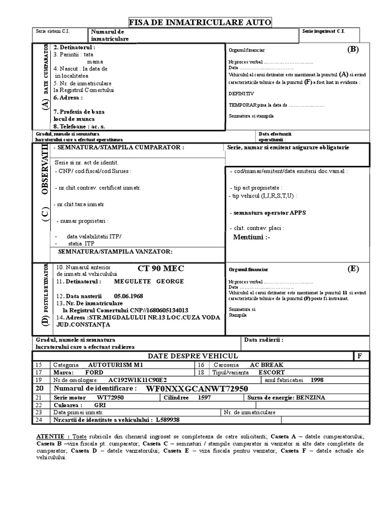 Fisa Inmatriculare Auto Cum Se Completeaza Model Cu Download